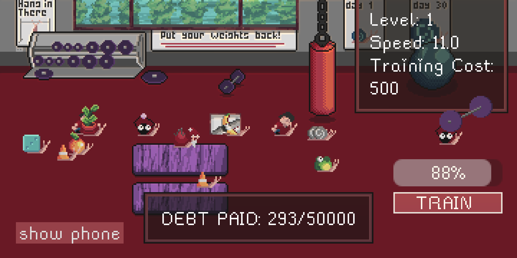I love these sorts of games, nice punch club vibes, and all the different snail sprites are so good, Put all my money on the frog and the soot sprite snails even when they're the worst option, no regrets.