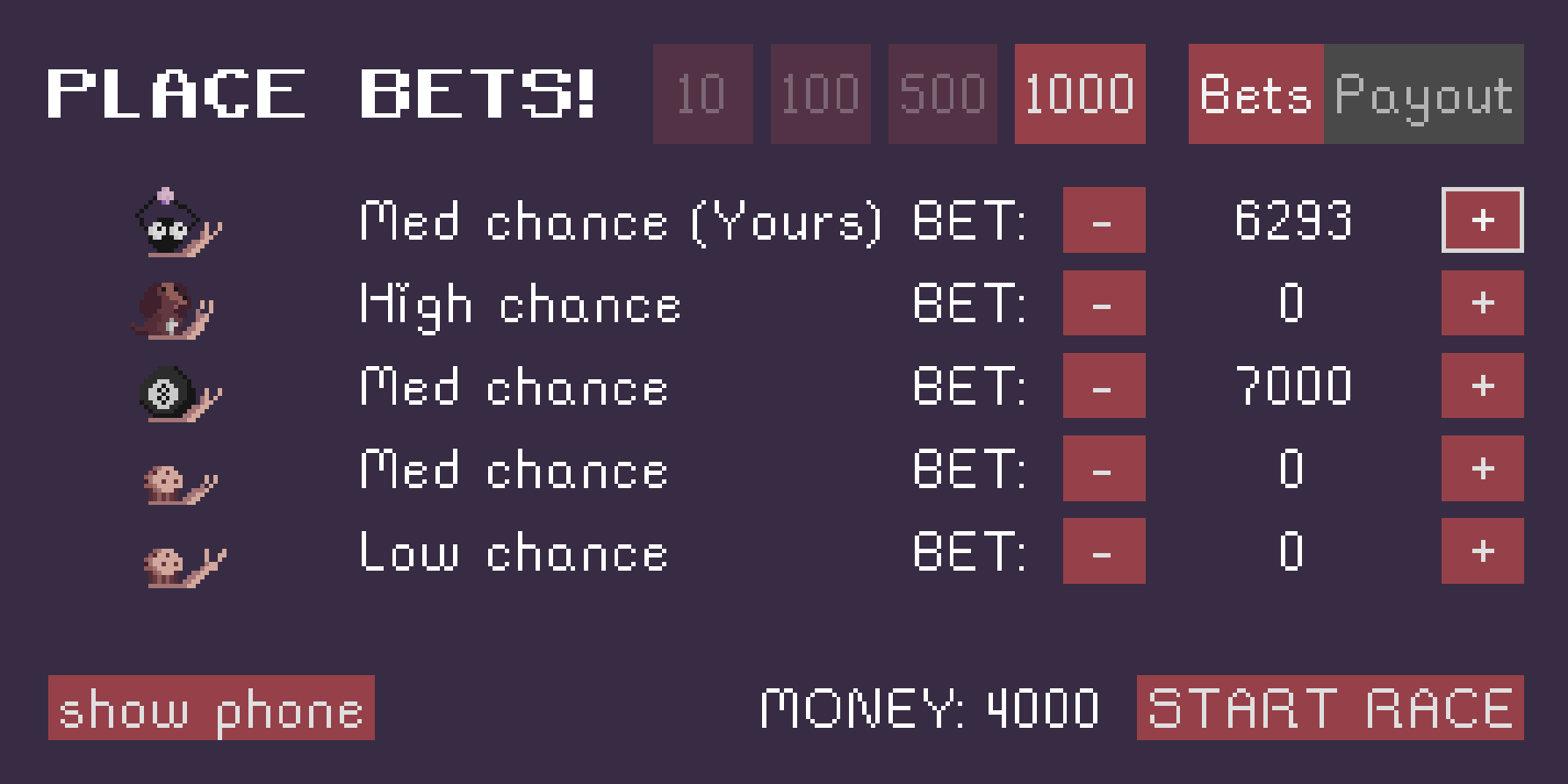 I'm posting this comment from a biscuit. I have no idea how, or why this has happened. But it has! Anyways, I got to like idk 15k or so. Then the game decided it was time for RNGsus to take the wheel and the only "High" win chance snail finished low enough to lose me money 5 races in a row and I called it quits.